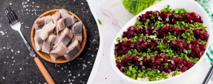 Lisaks sellele, et tegemist on väga maitsva salatiga heeringa ja peediga, valmib see ka võimalikult lihtsalt, mis lisab sellele ka boonuseid. Räim tuleb lahti võtta fileedeks või saab juba valmis hoidiseid osta. Viilutage iga tükk õhukesteks viiludeks, nagu “Shuba”, ja asetage kaussi. Seejärel võtke keedetud peet, koorige ja lõigake keskmise suurusega kuubikuteks. Tee sama ka keedetud munadega. Eraldi tükelda roheline sibul.